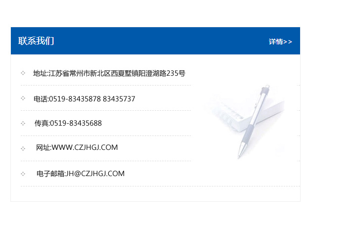 傳真:0519-83435688    郵編:213135    網址:WWW.czjhgj_com.yh1688.com    電子郵箱:JH@czjhgj_com.yh1688.com